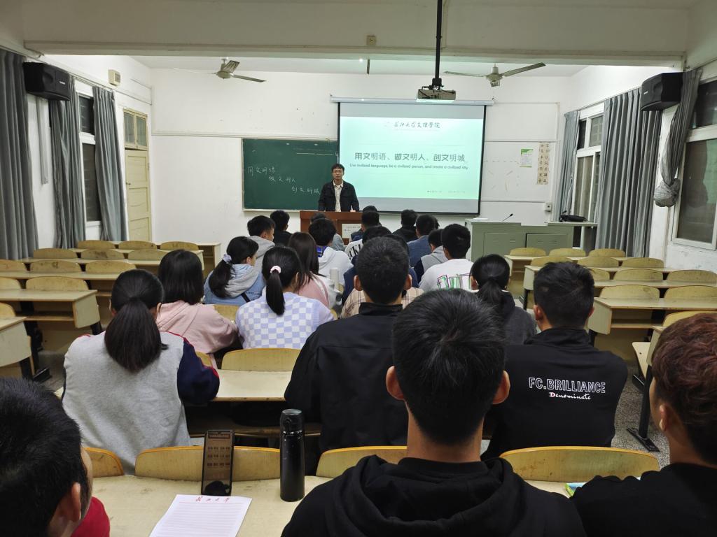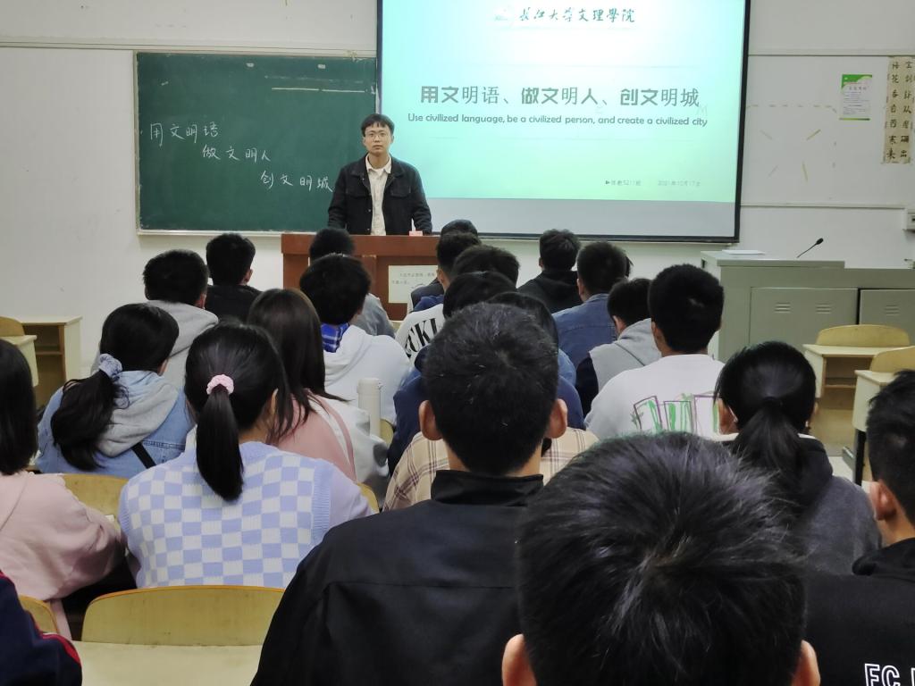 本网讯 (宣传委员 袁儒毅) 2021年10月17日晚19:00,体育系辅导员门世豪在2教302向体教5211班组织召开了“用文明语、做文明人、创文明城”主题班会。