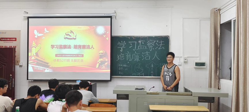(通讯员袁儒毅)为进一步做好党风廉政宣传教育工作,学习宣传监察法,增强员工的法律意识。体育系于9月7日晚7点整在西校区3教202开展关于“学习监督法,培养廉洁人”主题团课。