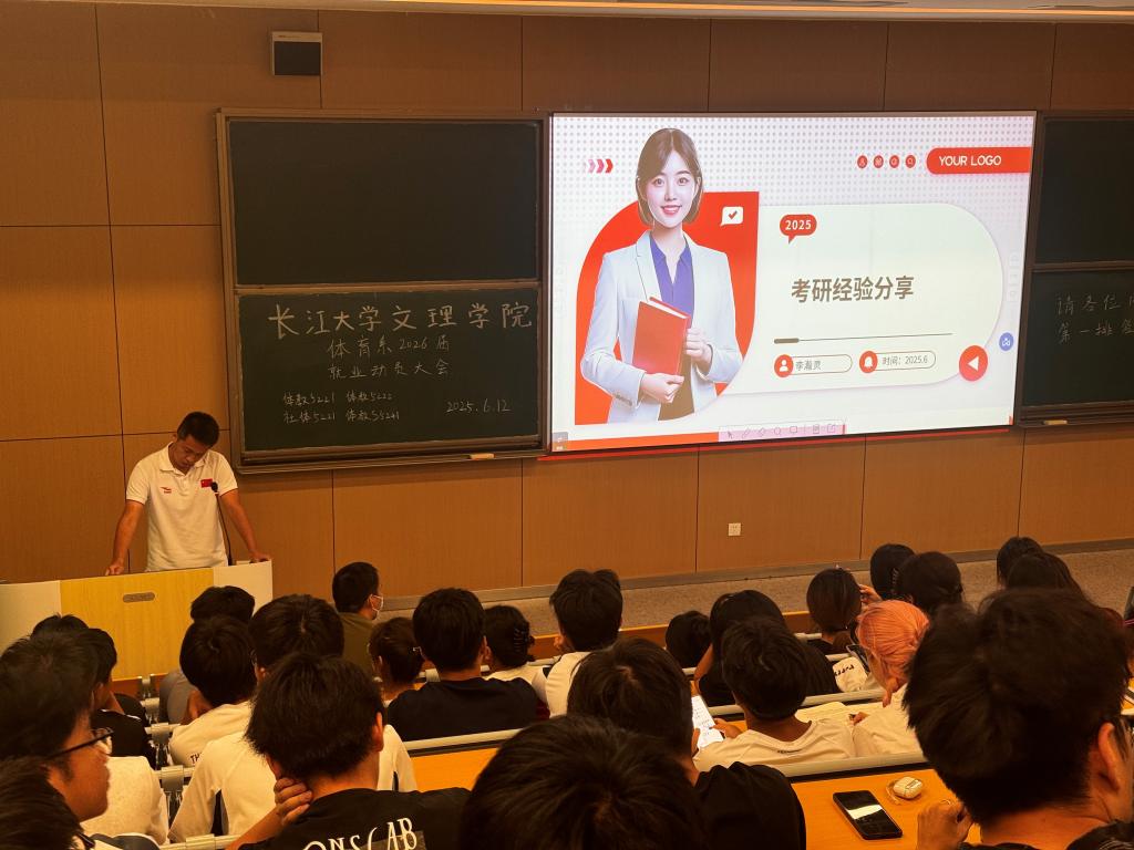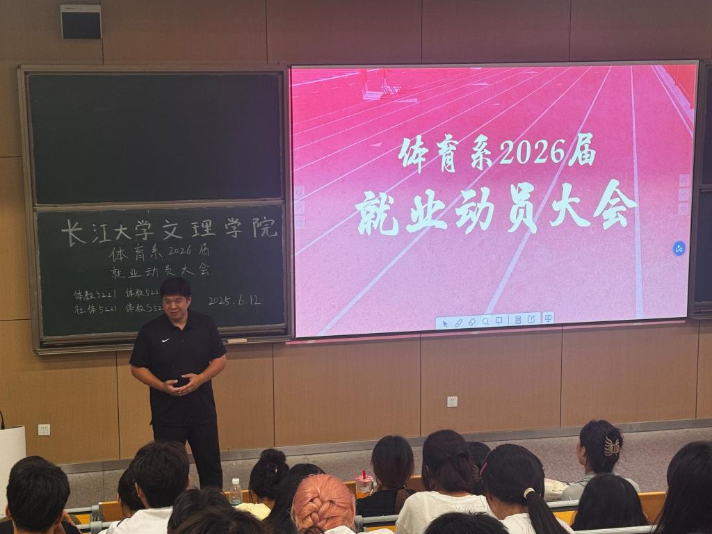 本网讯(通讯员 杨漫)2025年6月13日晚7点,体育系在教学楼B213教室举行了2026届就业动员大会。本次大会旨在为2026届毕业生提供就业指导与建议,帮助同学们明确未来发展方向,增强就业竞争力。大会由体育系党总支副书记赵婉君主持,体育系主任介博、体育系书记邹姜、辅导员杨漫、班主任谢侨侨、王崟麒及2026届全体员工参加了此次会议。