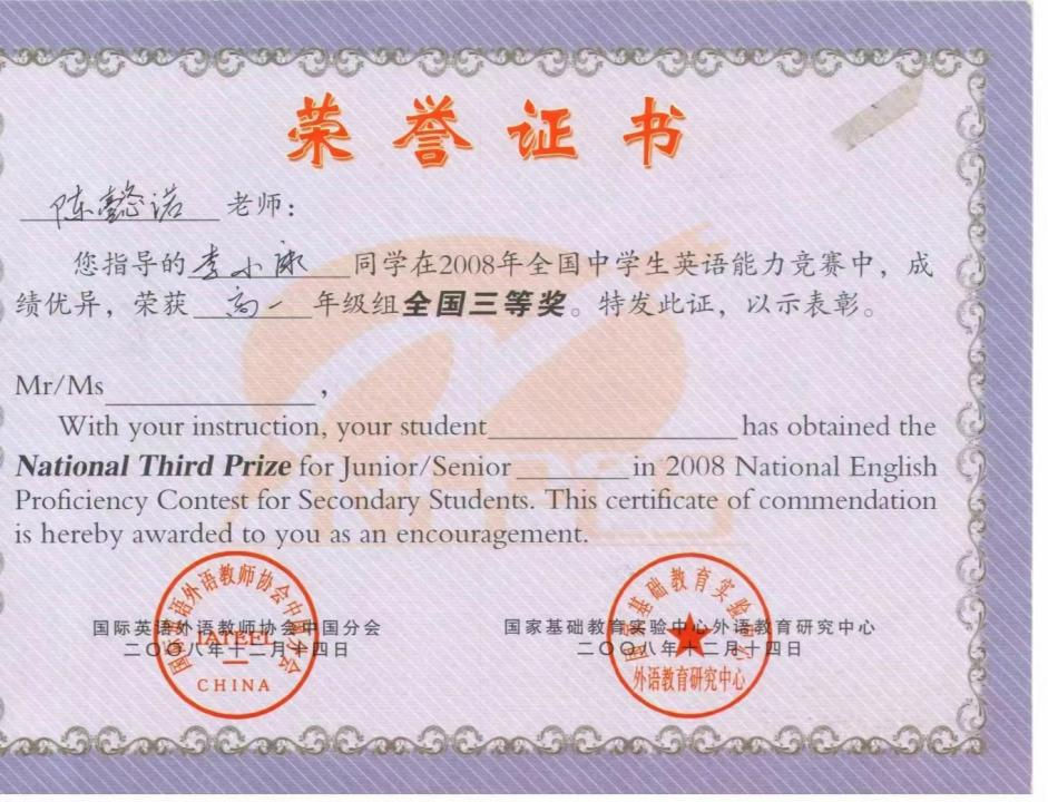 陈懿诺,beat365官网中文版本beat365官网中文版本2004级英语专业504103,2008届毕业生。毕业后至今在黄石市阳新县兴国高级中学任教。任教期间一直担任重点班的英语教学工作,同时数年来担任年级英语备课组长一职,并取得了优秀的成绩,深受校领导、同事、家长、员工的一致好评。曾指导员工荣获2008年全国中员工英语能力大赛高一年级全国三等奖,获得黄石市市级评课论课一等奖等各项荣誉。