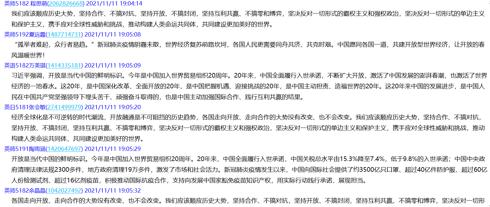11月11日学习内容以“习近平总书记在第四届中国国际进口博览会开幕式上发表主旨演讲”为主题,党员同志们在观看视频后对中国经济贸易上的不断开放与发展表达了认同,大家都深刻感受到了祖国的强大。海南自由贸易港跨境服务贸易负面清单已经出台,自由贸易试验区改革创新不断推进,外资准入持续放宽,营商环境继续改善,中欧投资协定谈判业已完成,区域全面经济伙伴关系协定国内核准率先完成。中国克服新冠肺炎疫情影响,推动对外贸易创新发展,是去年全球唯一实现货物贸易正增长的主要经济体,为保障全球产业链供应链稳定、推动世界经济复苏作出了重要贡献。加入世界贸易组织20年来中国的发展进步,是中国人民在中国共产党坚强领导下埋头苦干、顽强奋斗取得的,也是中国主动加强国际合作、践行互利共赢的结果。