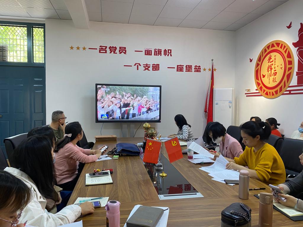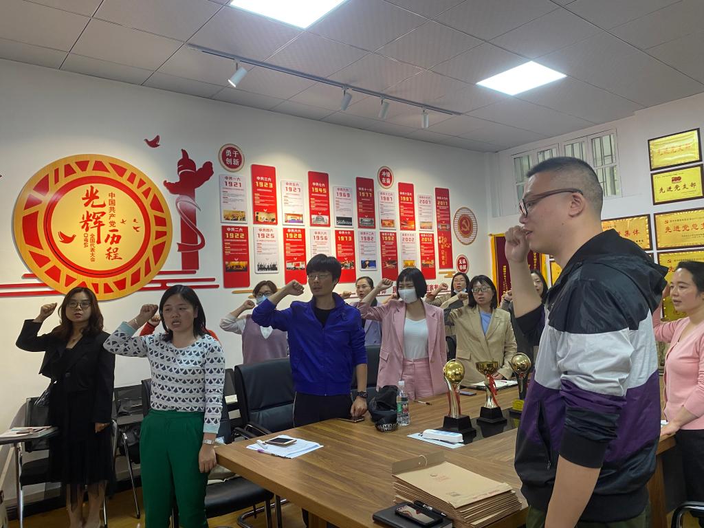 随后,付春霞带领全体党员重温入党誓词,集体诵读《中国共产党党章》第五章。大家集体观看视频习近平在庆祝中国共产主义青年团成立100周年大会上的讲话。最后,党员教师开展主题研讨:今年是师德师风建设年,结合自身岗位,谈如何做一名先进思想文化的传播者、党执政的坚定支持者、员工健康成长的指导者。