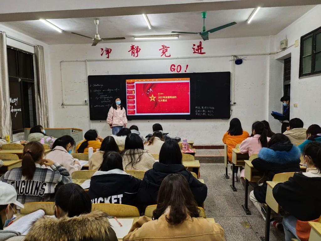 团课开始,班委首先向同学们介绍两会,传达两会精神,带领同学们回顾国家所取得的巨大成就,并了解“十四五”目标和2035远景目标的主要内容,感受到祖国的强大。随后,班委就“员工应该怎样学习两会精神”这一问题,组织同学们交流讨论,鼓励同学们积极发表意见。