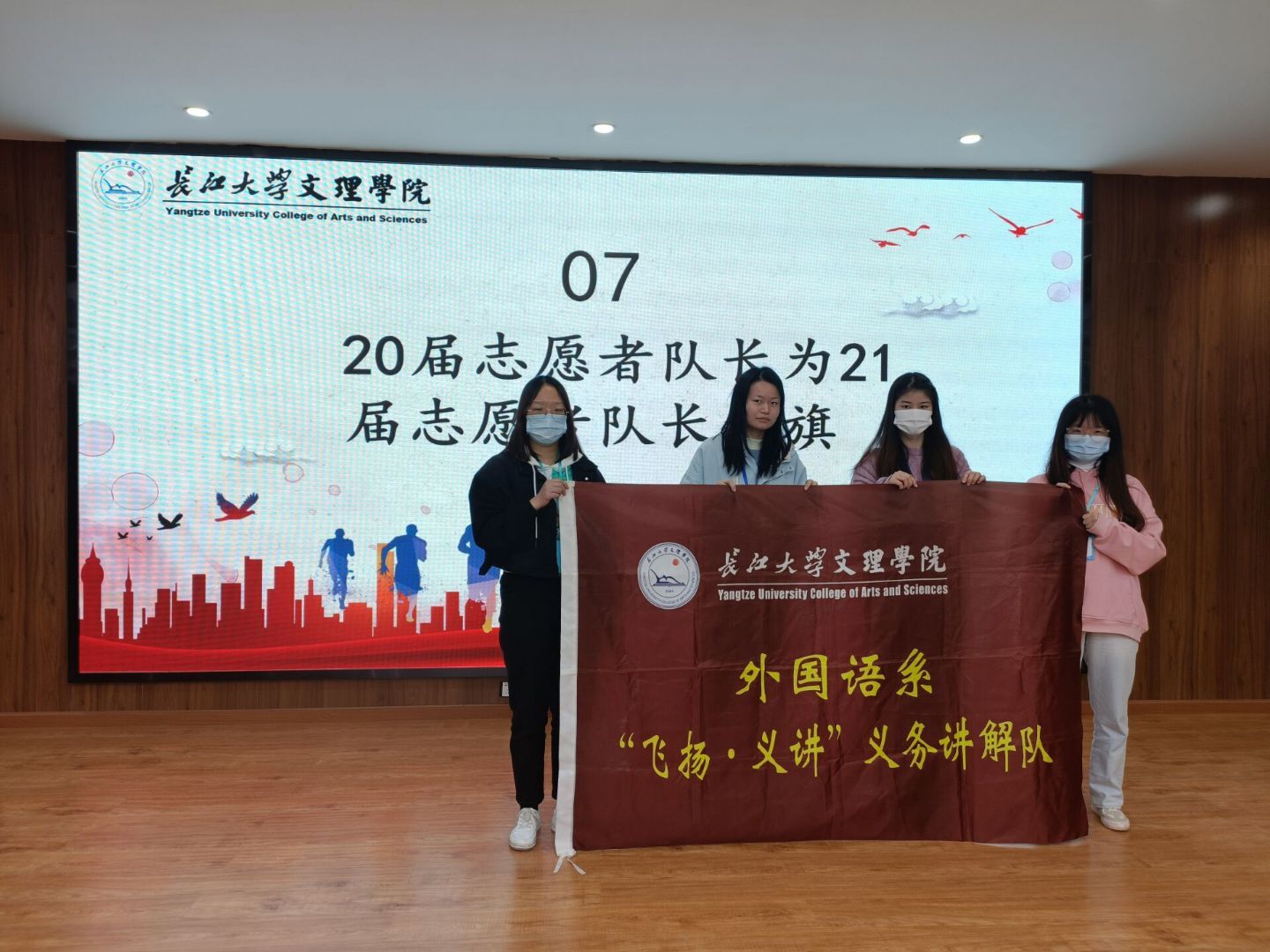 接着,20届青工部部长晏亮和21届青工部部长许金婷分别作部门工作总结和未来展望,20届志愿队队长为21届志愿队队长授旗。