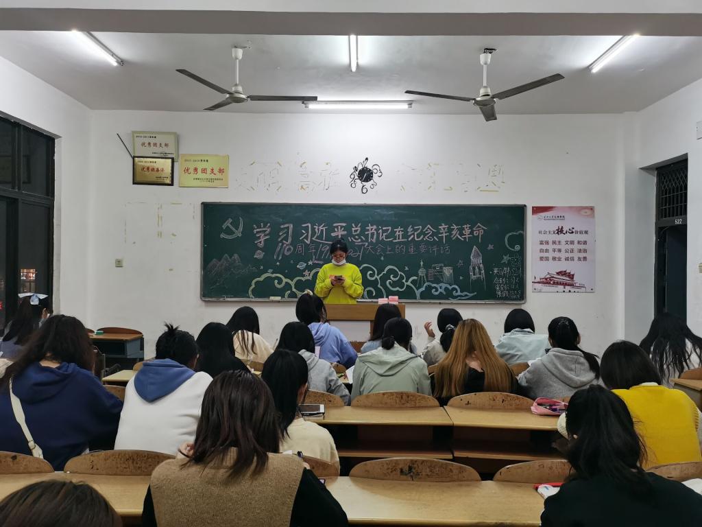 大会开始,班委为同学们讲解辛亥革命历史背景,表达了对孙中山先生等革命先驱的缅怀,赞扬中国人自强不息的顽强精神,并号召同学们学习他们为振兴中华矢志不渝的崇高精神,随后,班委带领同学们观看习近平总书记在纪念辛亥革命100周年大会上的讲话,员工代表上台发表心得感悟。