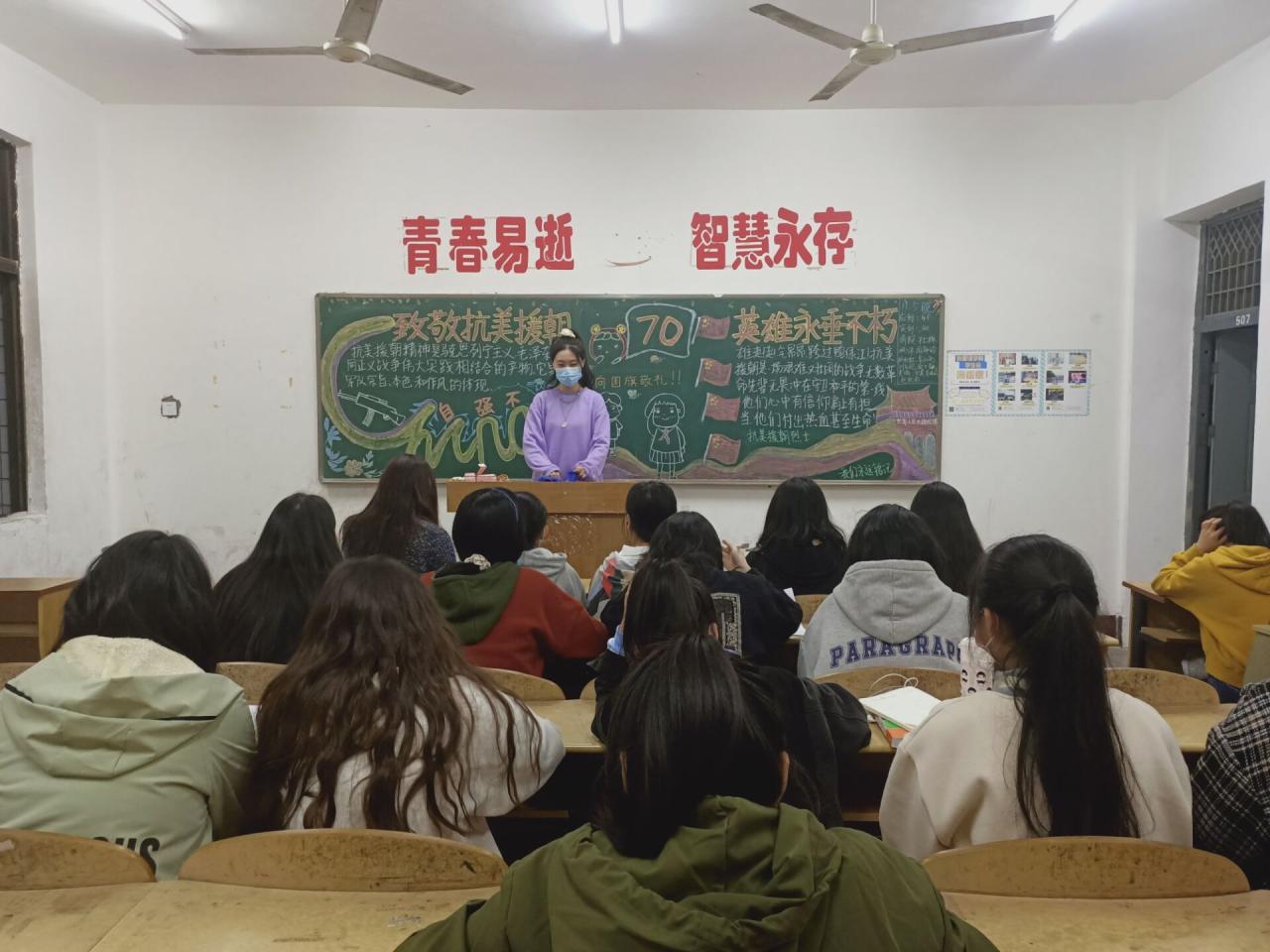 班委组织大家观看"纪念中国人民志愿军抗美援朝出国作战70周年大会"纪录片,介绍抗美援朝战役中英勇牺牲的烈士们以及他们不屈不折,奋勇争先的革命精神。抗美援朝战争捍卫了中国的安全,保障中国经济恢复和建设工作的顺利进行,增强了中国人民的民族自尊心。抗美援朝精神是中华民族精神的具体体现。