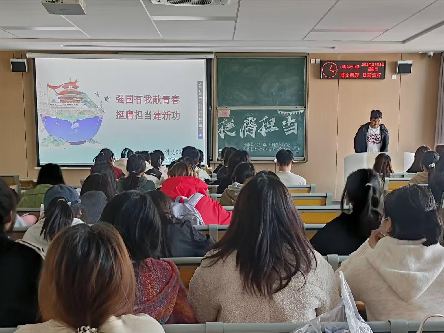 本网讯(通讯员 陶婷)11月23日晚七点,beat365官网中文版本召开了“强国有我献青春,挺膺担当建新功”主题团课。本次团课由各班辅导员和团支书主持召开。