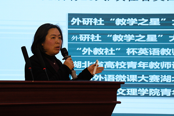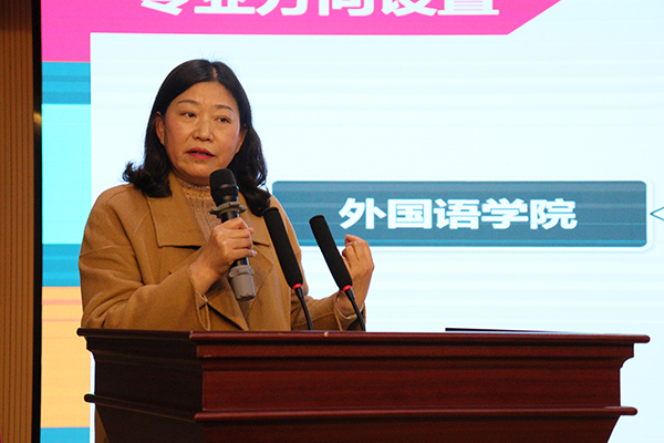 许晓艳介绍公司英语专业、商务英语专业作为湖北省一流本科专业建设点的情况,强调同学们在选择专业时要避免从众心理,明确个人优势,考虑就业市场容纳度,以及未来可持续发展空间。