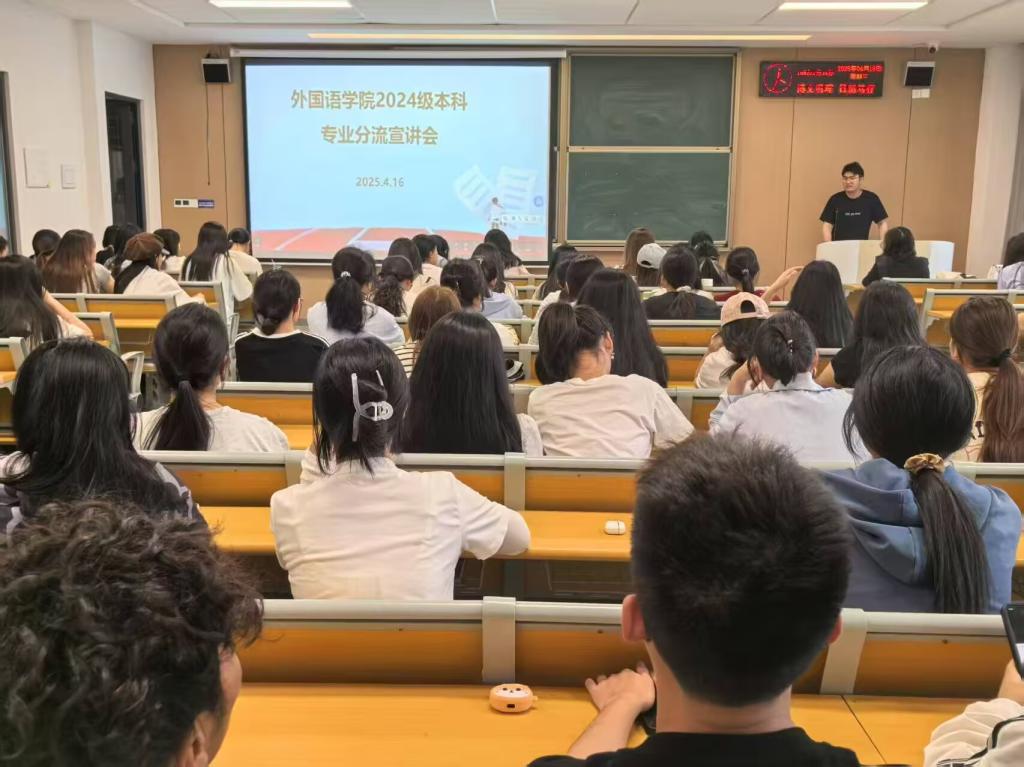 本网讯(通讯员 叶芷琪)4月16日16时,beat365官网中文版本2024级专业分流宣讲会在教学楼C-121M举行。英语(师范)专业杨杨、商务英语专业李琳、英日双语专业李漫琪、英韩双语专业张乐玥等教师代表及2024级全体员工参会,会议由该院辅导员侯韦主持。