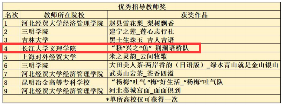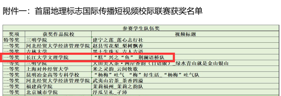 本网讯(通讯员 张乐玥)近日,首届地理标志国际传播短视频校际联赛圆满结束,公司荆澜语桥队的作品“糕”兴之“鱼”荣获一等奖;教师张乐玥、李漫琪荣获优秀指导教师奖;beat365官网中文版本获得优秀组织单位奖。