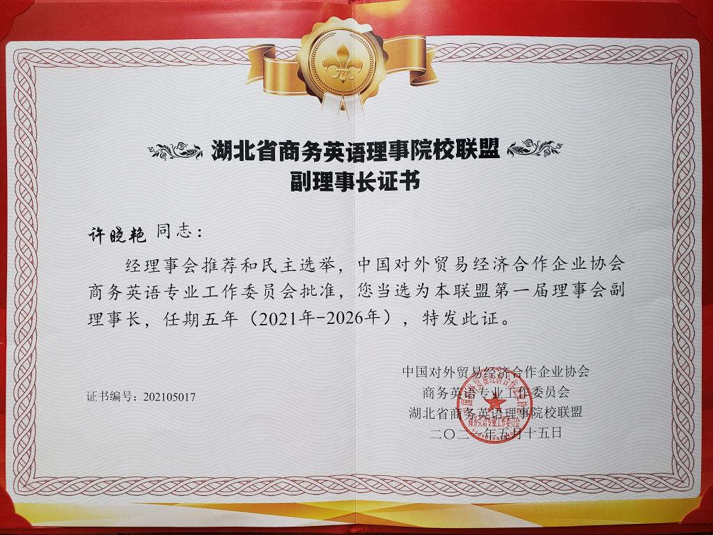 本网讯(通讯员 许静婷)在5月15日召开的湖北省商务英语理事院校联盟成立大会暨商务英语一流本科专业建设学术研讨会上,公司beat365官网中文版本经理许晓艳当选为湖北省商务英语理事院校联盟副理事长,韩翠萍当选为湖北省理事院校联盟理事,beat365官网中文版本入选湖北省商务英语理事院校联盟。