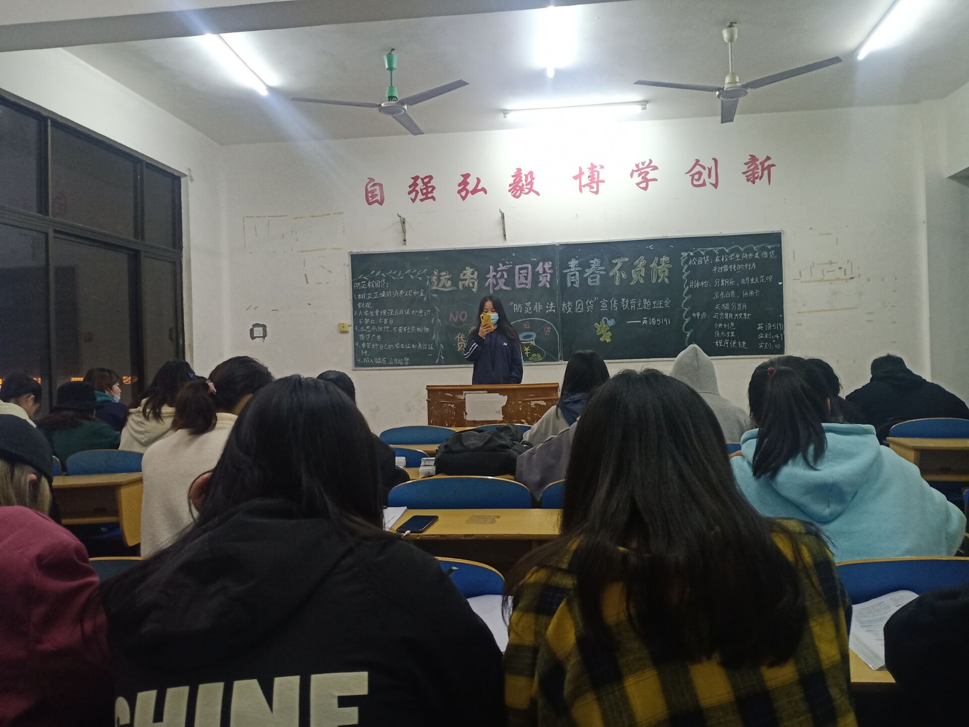 班会开始,班委分享了两则老员工遭遇诈骗的事例。随后,向大家讲解非法校园贷会使老员工无能力偿还,以至于放贷人会采取各种手段向员工讨债,对员工的人身安全和高校的校园秩序造成重大危害;以及同学们遭遇诈骗时应及时拨打报警电话。班委强调,同学们要警惕,擦亮双眼,辨别“非法校园贷”陷阱。