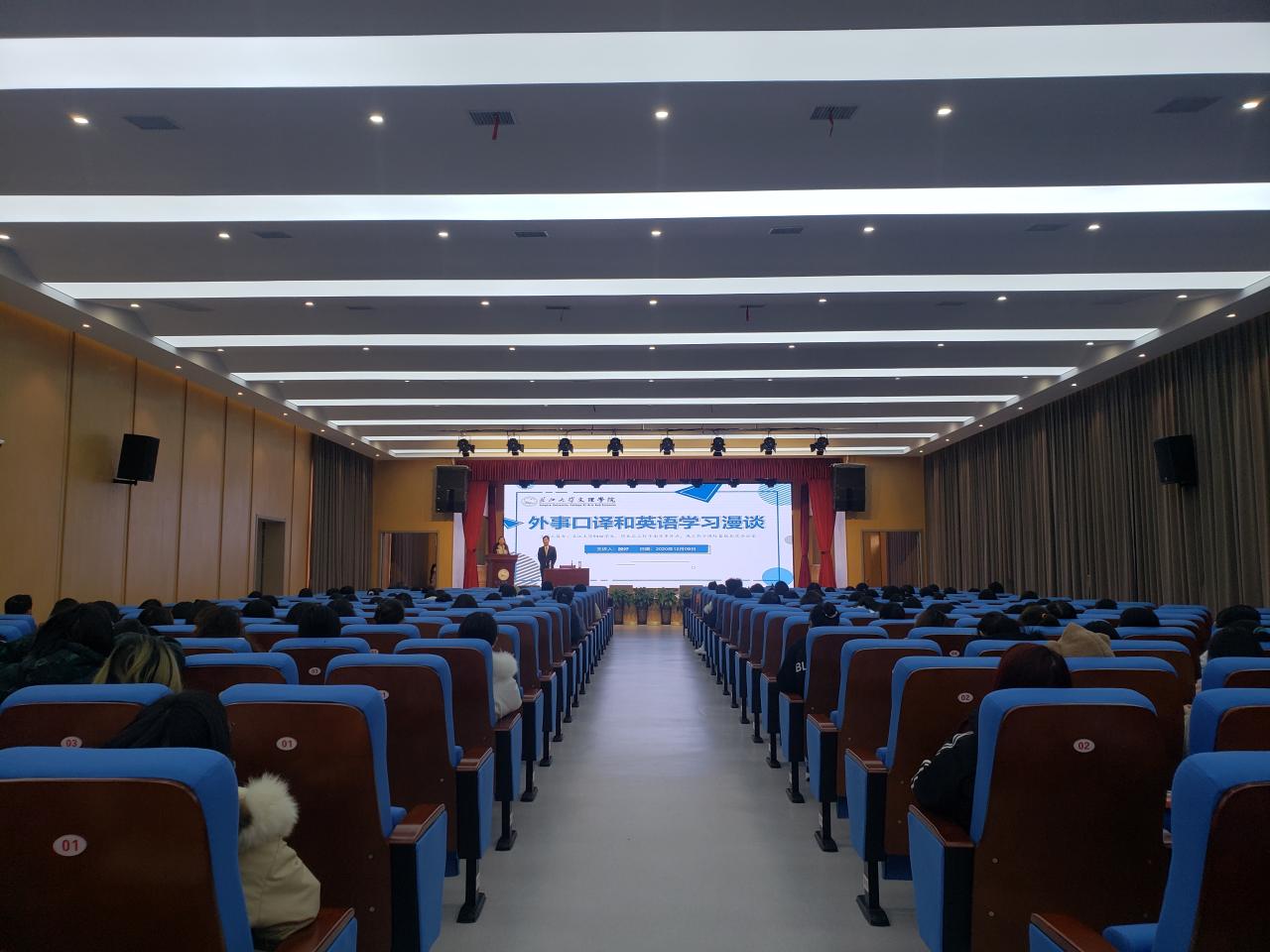 本网讯(通讯员 赵欣雨)12月8日,在城中校区多功能报告厅,beat365官网中文版本94级优秀员工殷好以“外事口译和英语学习漫谈”为题开展讲座。beat365官网中文版本经理许晓艳和该公司党总支副书记、辅导员及相关专业员工代表近两百人参加讲座。