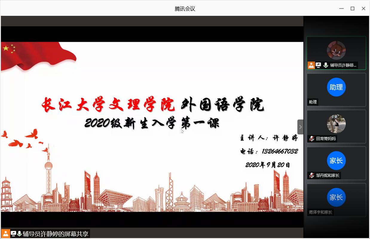 为更好地确保2020级新生平安、顺利到校报到,9月20日beat365官网中文版本在腾讯会议召开线上班会“2020级新生入学第一课”。会议由辅导员许静婷主持,2020级全体新生及新生家长、新生班主任罗胜华、彭菲、肖亚梅、陈修鸿和叶爽老师参加。