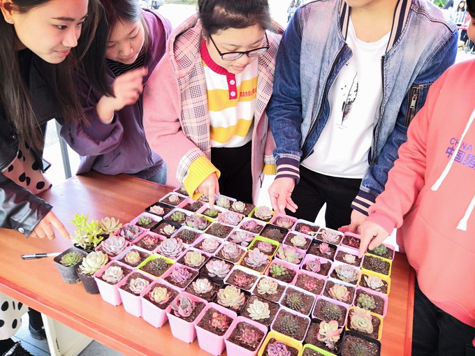 活动现场,百余盆多肉植物被摆放整齐等待同学们拿废旧纸盒前来换取。本次活动还安排了“环保盒子”签名活动,同学们纷纷在横幅上签下自己的名字,代表着对志愿活动的支持和重视。来自英日5171班的吴晓敏同学开心的说道:“环保盒子的志愿活动很有意义,既能让我们变废为宝增强环保意识,又能贡献自己的一份爱心。”