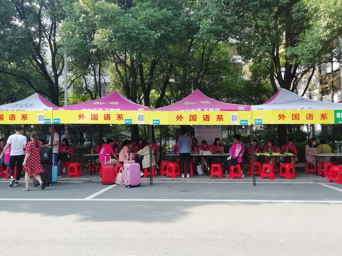 5日上午9时,外国语系员工会主席团、各部部长于迎新站点集合完毕。外国语系党支部书记刘美林老师与党支部副书记王玲玲老师也早早来到了报到处,与各部门工作人员一起帮助新生报到。工作人员分工明确,各司其职,很快就完成了迎新的准备工作:挂起写有“外国语系”的院标,搬来报名所需要的材料与设备。工作人员也在报名入口处早早地立起了外国语系的标志牌,以便新生同学报到时尽快找到外国语系的位置。下午两点新生们陆续来校报道,一群挂着迎新工作牌的身影在人群中忙碌着,接待、引导、解答问题,一切都在微笑中有条不紊的进行着。