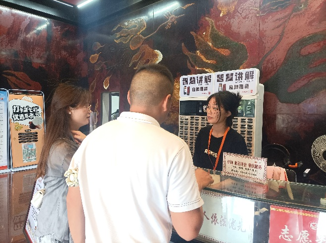 志愿者准时到达博物馆,认真听从博物馆负责人的工作分配,积极协助门卫及其他工作人员,耐心回答游客疑问。即使天气炎热,志愿者们依然坚守在岗位上,将志愿者精神贯彻到底。