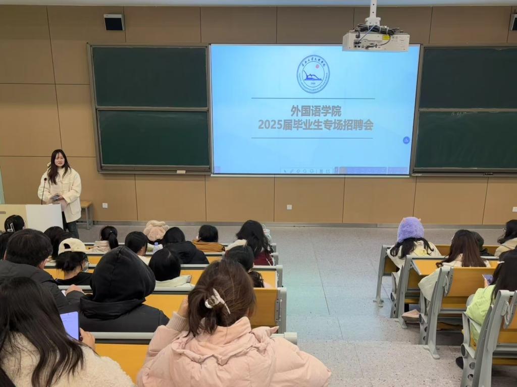临安园区人才服务中心的刘总深入介绍杭州市临安区外贸跨境人才引进情况,涵盖园区区位交通优势、电缆电线产业、装饰纸产业等特色产业,以及当地历史人文与产业平台建设成果。同时展示校企合作成功案例,阐述外贸业务员岗位招聘所要求的专业技能与综合素养。义乌市知见企业管理咨询有限公司的陈总从“我们是谁”“为何选择义乌”“我们的人才需求与岗位详情”“联合关于我们”以及“如何加入我们”五个维度全面深入的讲解义乌电商,为毕业生们呈现了义乌电商领域广阔的发展前景与机遇。思考乐宣讲环节,叶老师介绍集团团队力量,相关招聘信息以及文化活动与社会福利。上海合橙网络公司郑老师介绍公司项目、企业概况与岗位。