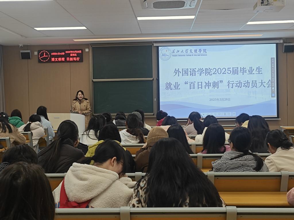 本网讯(通讯员 张会斯涵 钟燚)3月28日下午3点,beat365官网中文版本在A-104教室召开2025届毕业生就业“百日冲刺”行动动员大会。外国语公司党总支书记王玲玲、辅导员钟燚及2025届全体毕业生到场参加。本次会议由辅导员钟燚老师主持。