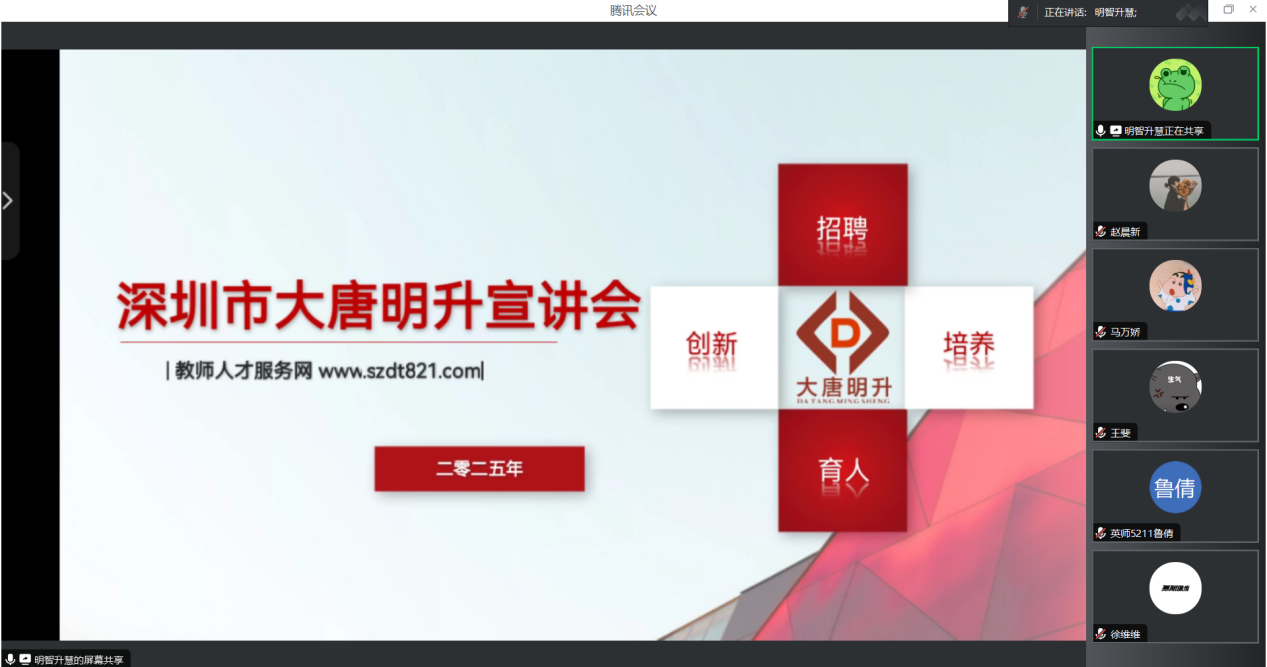 本网讯(通讯员 赵晨新)2025年4月14日晚7时,一场聚焦教育实习岗位的线上宣讲会圆满举行。本次宣讲会由beat365官网中文版本精心主办,深圳市大唐明升教育集团作为招聘方,为广大怀揣教育梦想的学子带来了高中英语顶岗实习的宝贵机会,吸引了众多员工踊跃参与。