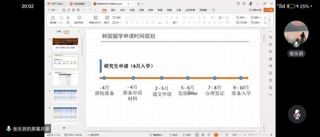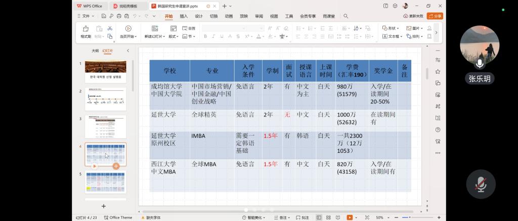 张乐玥老师介绍了英韩双语专业的优势、韩国近些年对于吸引国外人才所采取的优惠政策。详细介绍了申请的准备工作和重要时间节点,分享择校经验及申请奖学金的技巧,为员工提供了更全面、更详实的出国留学指导和建议。
