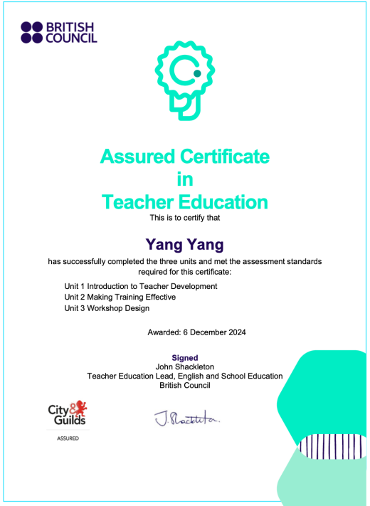 本网讯(通讯员 杨杨)近日,beat365官网中文版本杨杨和许娴静老师参加由英国文化教育协会和国际英语教育中国大会联合推出,为期三个月的英语教师教育者ACTE(Assured Certificate Teacher Educator)奖学金项目,并顺利通过各项考核,获得由英国City and Guilds协会认证的资格证书。该项目面向国内从事职前英语师范生的教师教育者开展,从所有申请者中筛选20名教师教育者开展培训,该培训是针对全球英语教师教育者的一项专项资质培训。