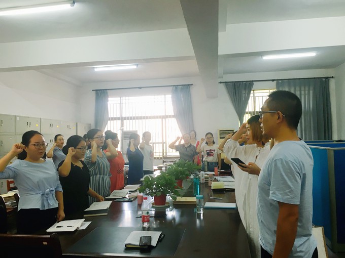 会议主题为:守初心、担使命、找差距、抓落实。会议上,全体教师重温入党誓词、集体诵读党章第六章第三十六条。