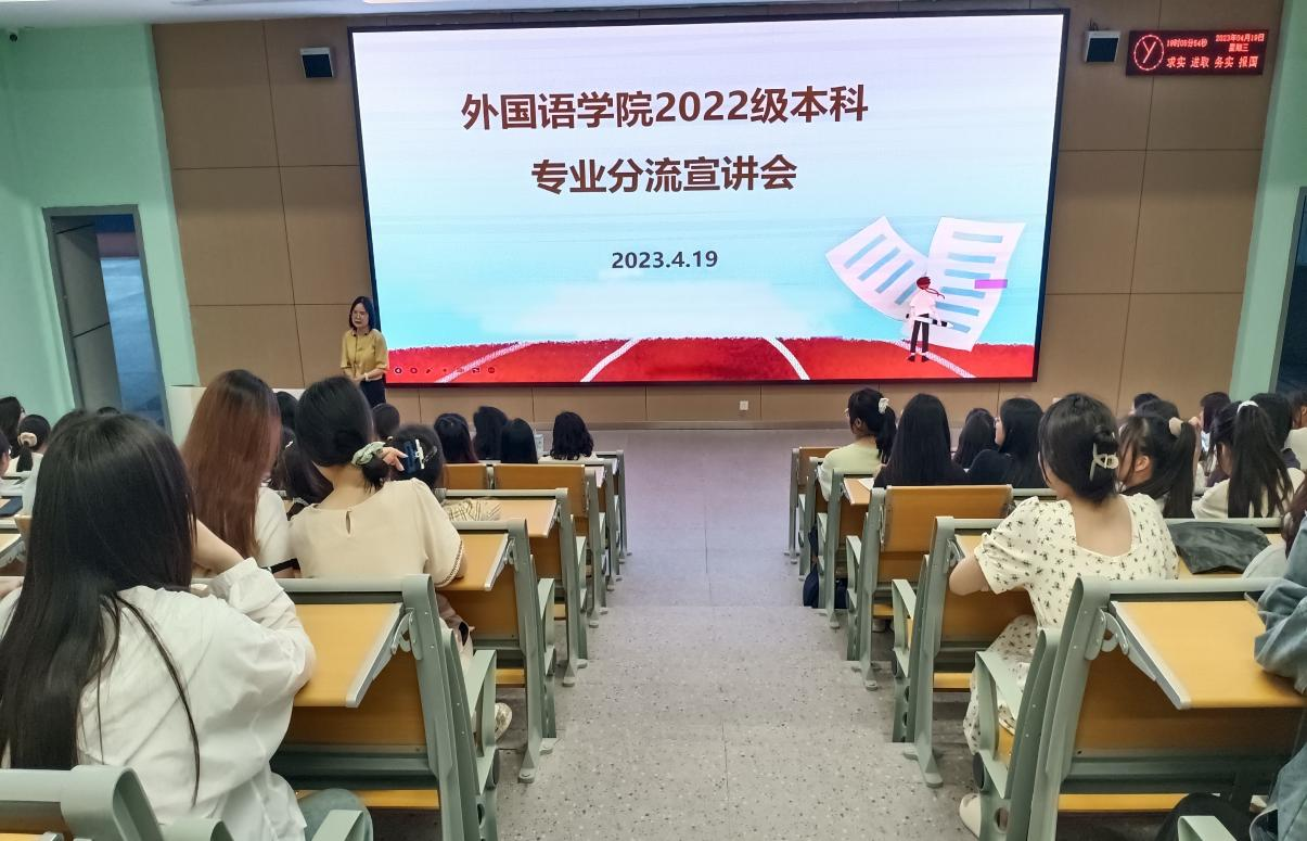 (通讯员 柏斌)2023年4月19日,beat365官网中文版本于教学楼B-214召开2022级专业分流宣讲会。beat365官网中文版本副经理韩翠萍教授、英语(翻译)方向罗丹老师、英语(师范)方向杨杨老师、英韩双语方向张乐玥老师、英日双语方向李漫琪老师、商务英语专业李琳老师、各班班主任、辅导员以及全体2022级员工参加此次会议。beat365官网中文版本副经理罗丹主持会议。