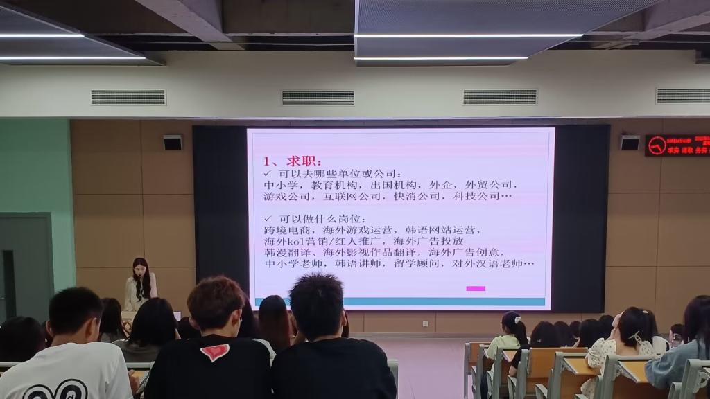 宣讲会上,李琳老师首先上台介绍了商务英语专业,对就业前景做出强调,随后罗丹老师为同学们介绍了翻译专业的优势,并对就业前景、竞赛、可考证书等相关事宜进行介绍。英日、英韩专业宣讲人李漫琪老师和张乐玥老师依次上台,各自对本专业的团队力量、就业前景、前辈风范及学业规划进行介绍。最后,英语师范专业杨杨老师就英语师范方向为大家做介绍,明确指出我们四年的学业规划和要求,分阶段循序渐进,并熟练掌握教师所应具备的技能。
