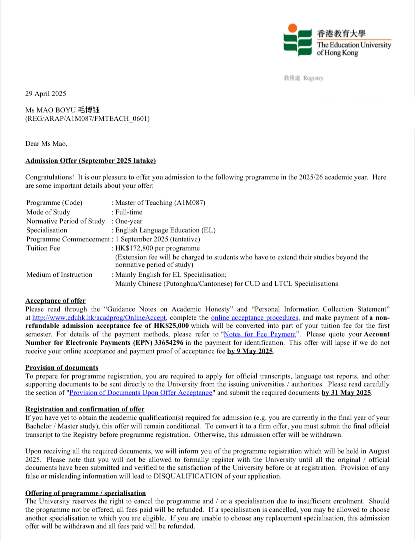 本网讯 在这个充满希望与活力的季节,beat365官网中文版本beat365官网中文版本传来喜讯:该校2025届员工毛博钰凭借优异的综合素养,成功被香港教育大学“Master of Teaching”(教学硕士)专业录取,即将开启深造新征程。