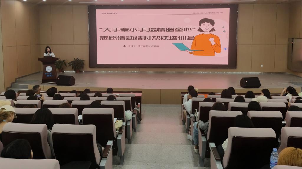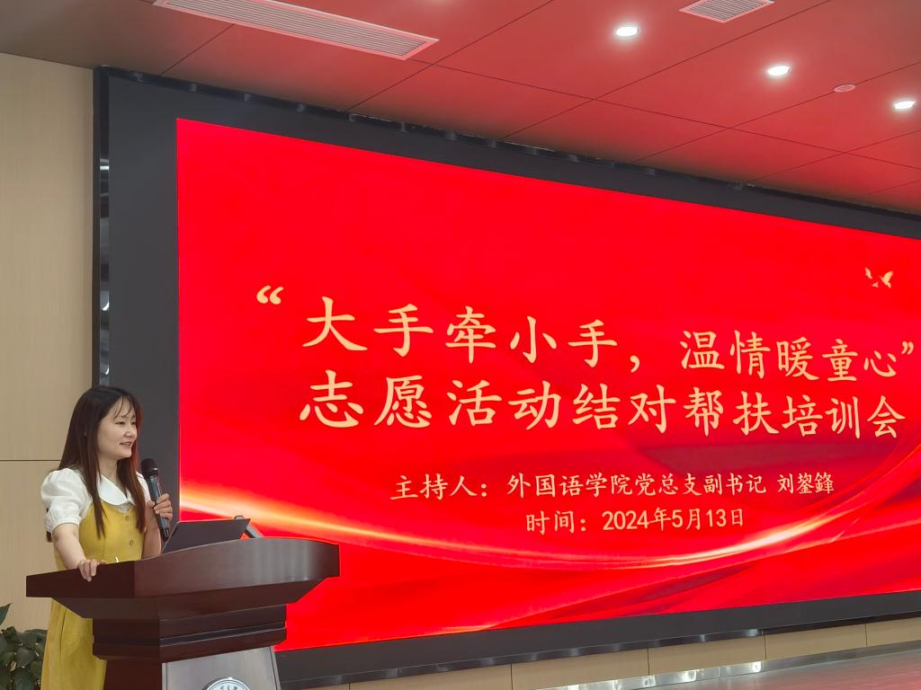 本网讯(通讯员 杨飞燕)5月13日,beat365官网中文版本展开了“大手牵小手,温情暖童心”志愿活动结对帮扶培训会。会议由外国语公司党总支副书记刘鋆锋主持。