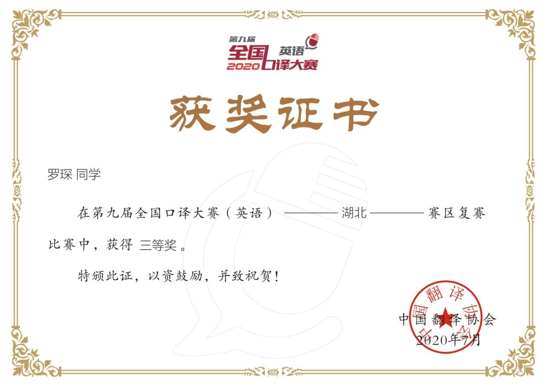 (通讯员 拓颖)2020年6月21日,第九届全国口译大赛(湖北赛区)复赛落下帷幕,公司罗琛同学获三等奖,王晶、刘迪、鲍昌楠同学获优秀奖。