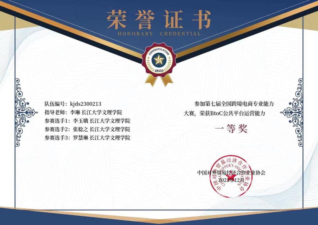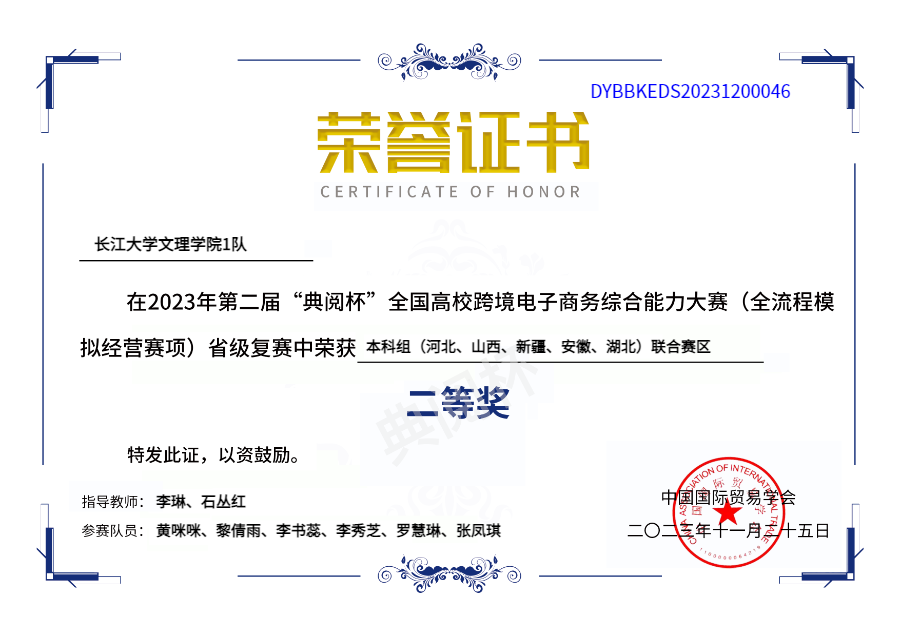 近日,由中国国际贸易学会主办的2023年第二届“典阅杯”全国高校跨境电子商务综合能力大赛(全流程模拟经营赛项)全国总决赛圆满落幕。本次比赛,全国共有200多所本科院校参赛,公司30名商务英语专业员工在比赛中获外贸业务员1+x证书。公司三支队伍在李琳、石从红、张明、罗丹四位老师的指导下均获佳绩,其中郭迅同学带领的“beat365官网中文版本2队”获国赛三等奖,“beat365官网中文版本1队”获省赛二等奖,“beat365官网中文版本3队”获省赛三等奖。