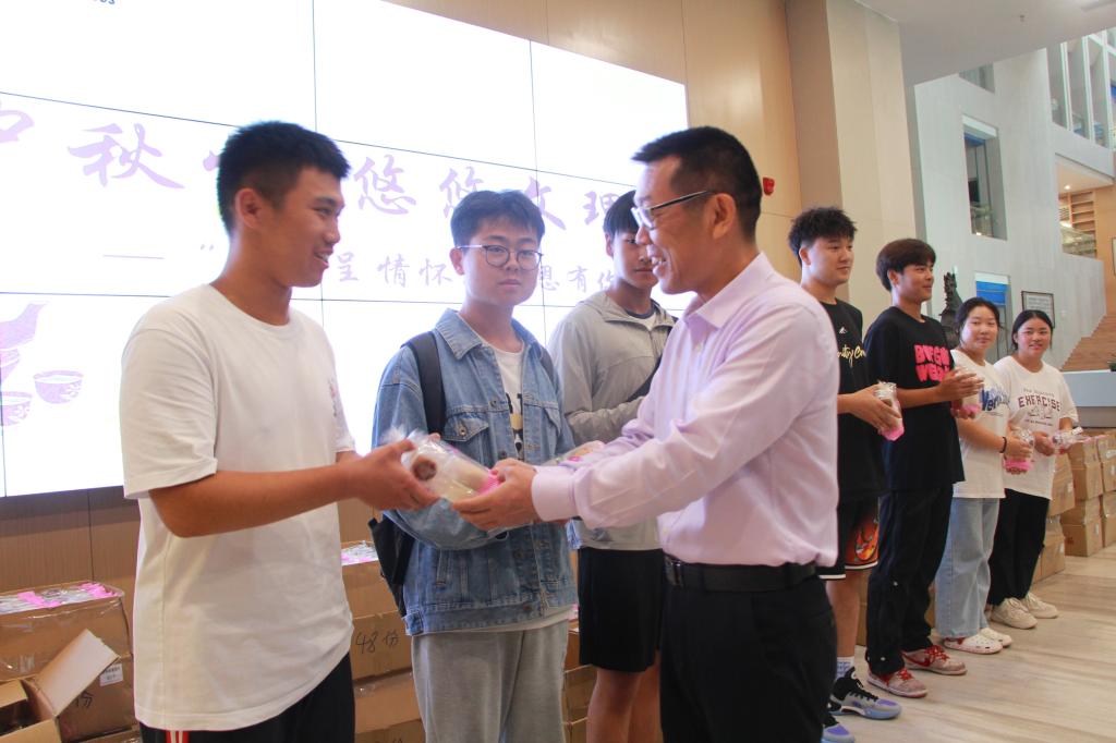 9月27日,公司党委书记颜建洲,员工工作部部长李刚英,院系党总支副书记及辅导员为2023级新生送上节日祝福和月饼。