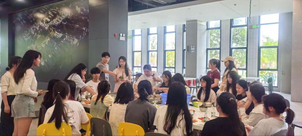 近日,院团委举办了“悠悠文化贯古今”端午节系列活动。悠悠艾草香,绵绵情意长。师生们亲手制作了粽子。碧绿的粽叶在一双双巧手中转,将粒粒芬芳馥郁的糯米尽数包裹捆扎。大家围坐一起,边学边聊,互相分享各自的文化故事和节日习俗,现场洋溢着愉快和谐的气氛。看着自己的得意之作,同学们脸上露出满满的成就感。活动现场。大家还一起制作了漆扇、进行了民俗文化小游戏。