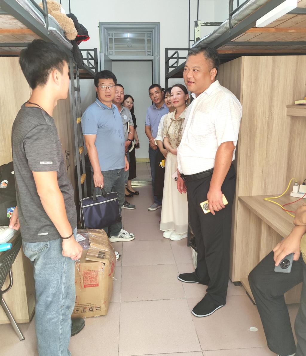 “老家是哪里的呀?”“对公司宿舍还满意吗?还有什么需求吗?”……一声声亲切的问候温暖了同学们的心。在走访过程中,校领导与同学们和家长进行了亲切交谈,详细询问了到校感受和入住情况,叮嘱同学们要注意宿舍安全及用电安全,提高安全防范意识。