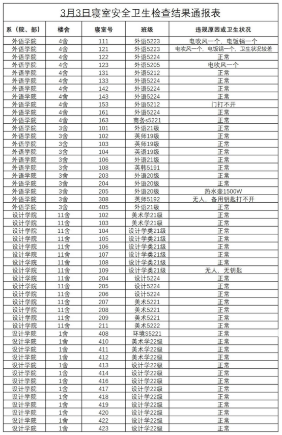 2022-2023学年第二学期第三周寝室安全卫生抽查结果通报