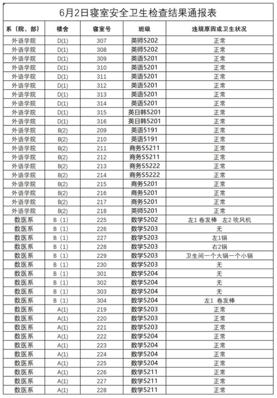 2022-2023学年第二学期第十六周寝室安全卫生检查结果通报