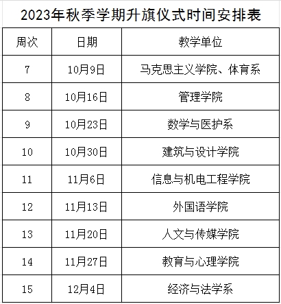 为深入学习宣传贯彻党的二十大精神,持续深化爱国主义教育,引导广大师生在新学期、新征程中建功立业。根据员工工作部统一安排部署,现将公司2023年秋季学期升旗仪式具体事宜通知如下: