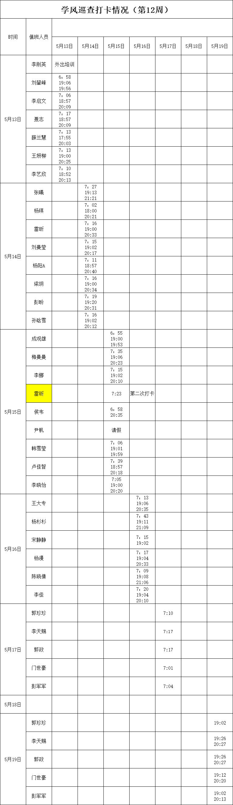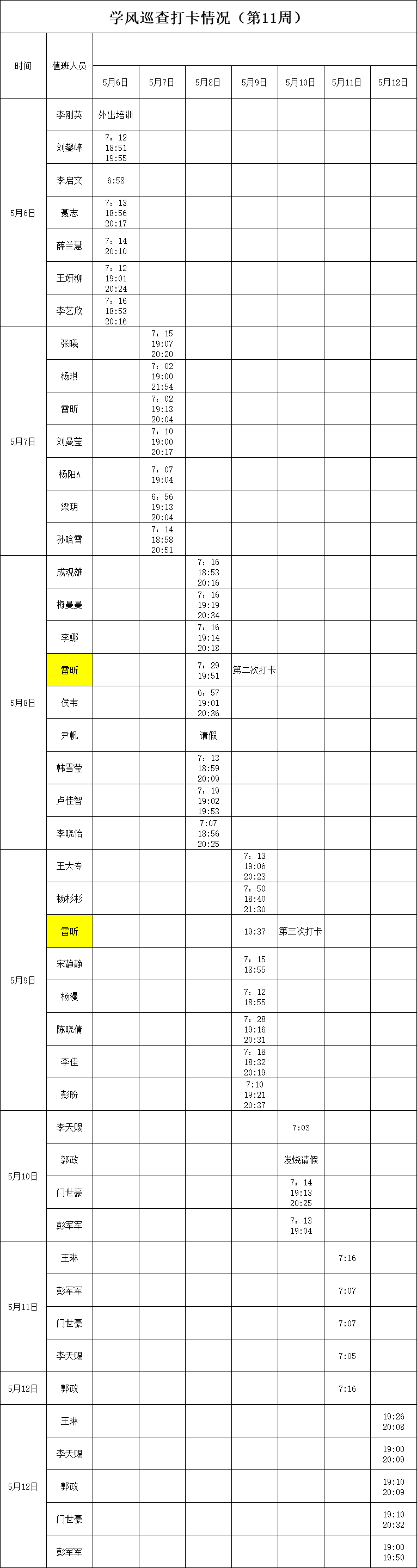 2023-2024学年第二学期第11-12周学风巡查打卡情况公示