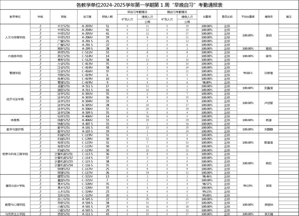2024-2025学年第一学期第1周早晚自习考勤通报