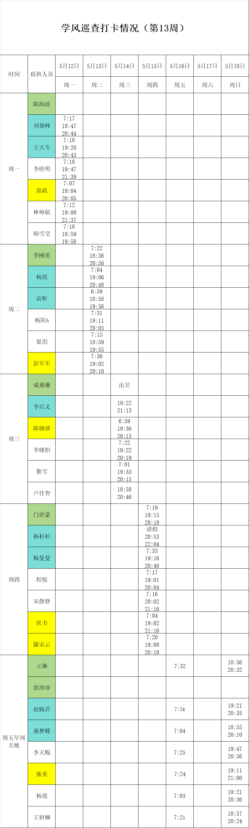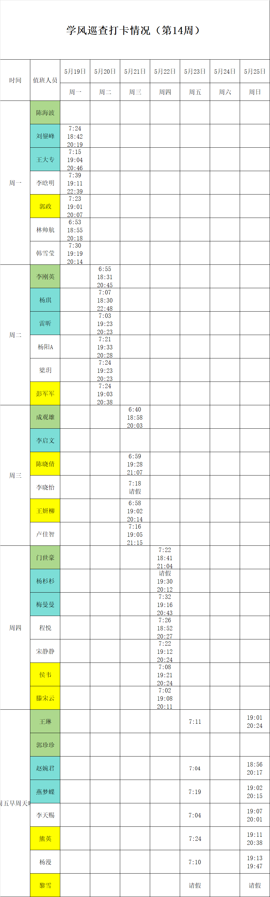 2024-2025学年第二学期第13-14周学风巡查打卡情况公示