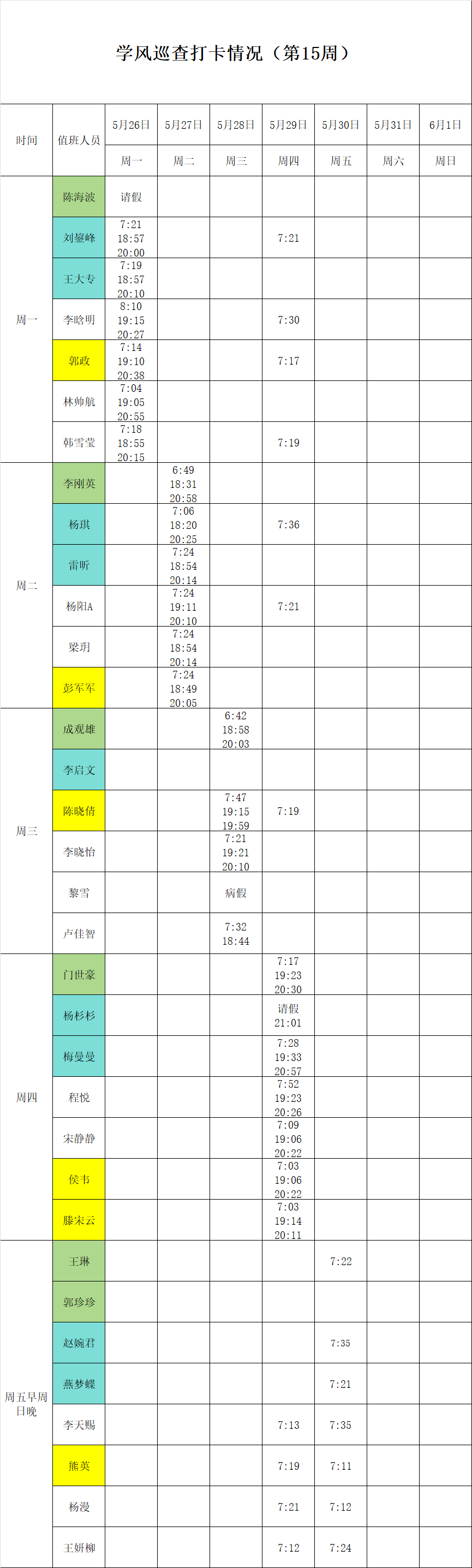 2024-2025学年第二学期第15-16周学风巡查打卡情况公示
