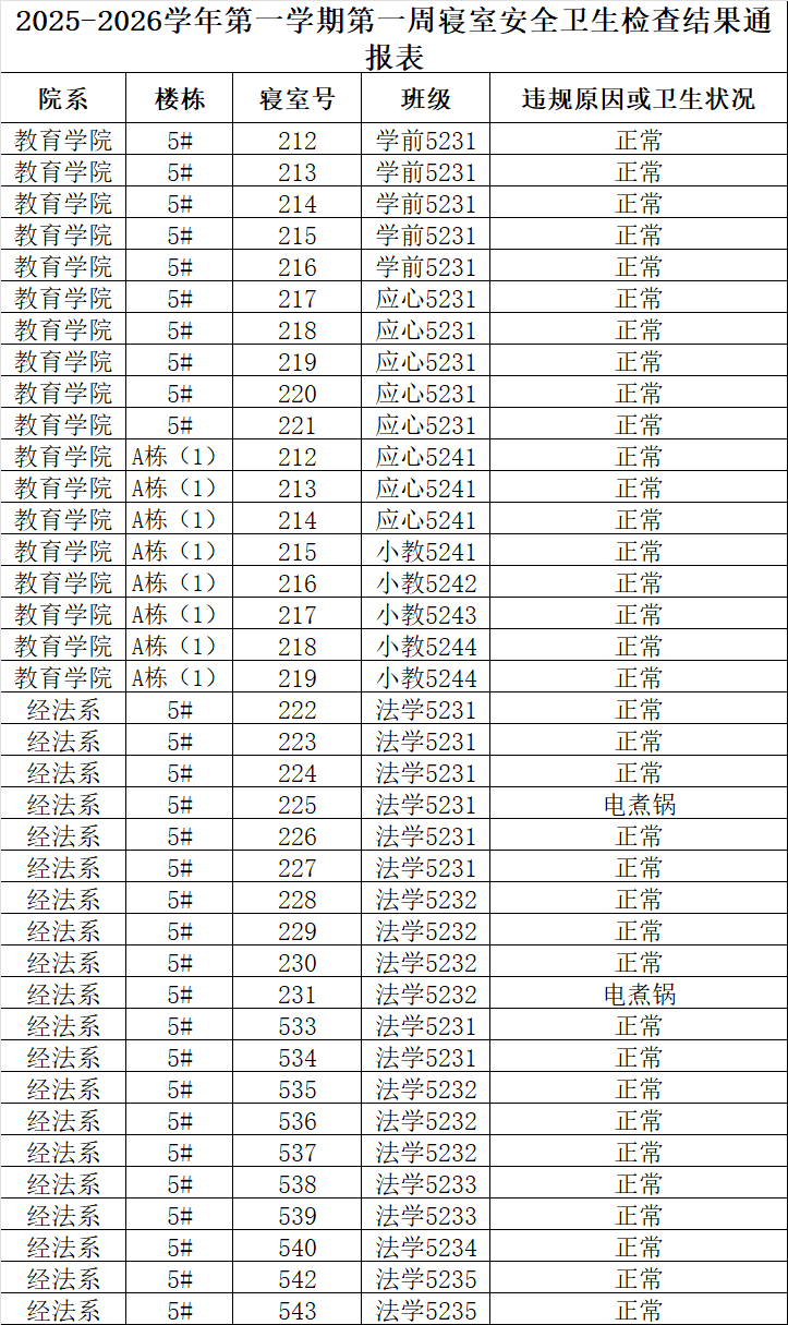 2025-2026学年第一学期第一周寝室安全卫生检查结果通报表