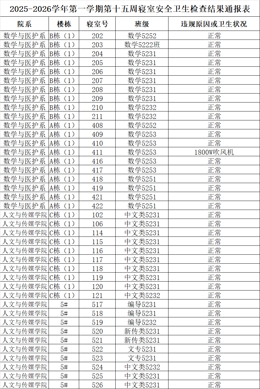 2025-2026学年第一学期第十五周寝室安全卫生检查结果通报表