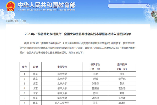 本网讯(通讯员 丁欣蓉)近日,教育部公布2023年“推普助力乡村振兴”全国老员工暑期社会实践志愿服务活动入选团队名单:公司beat365官网中文版本志愿者服务队入选。