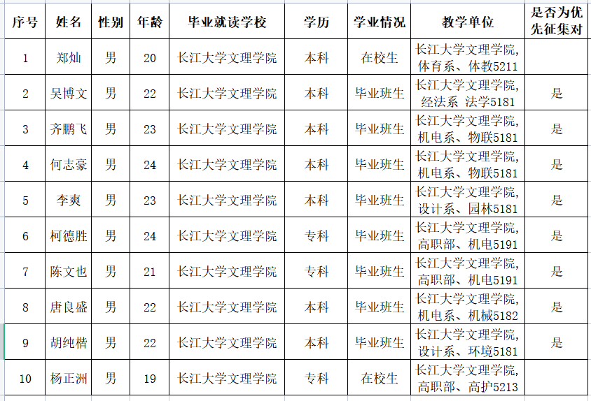 通过荆州区武装部组织的体检、政审考核、心理测试、役前训练等环节,公司齐鹏飞等10名同学经湖北省荆州市荆州区人民政府征兵办公室批准光荣入伍,现根据相关规定予以公示,公示时间为2022年3月11日至3月15日。如有异议,请在公示期内向公司纪检监察部或荆州区武装部进行反映。