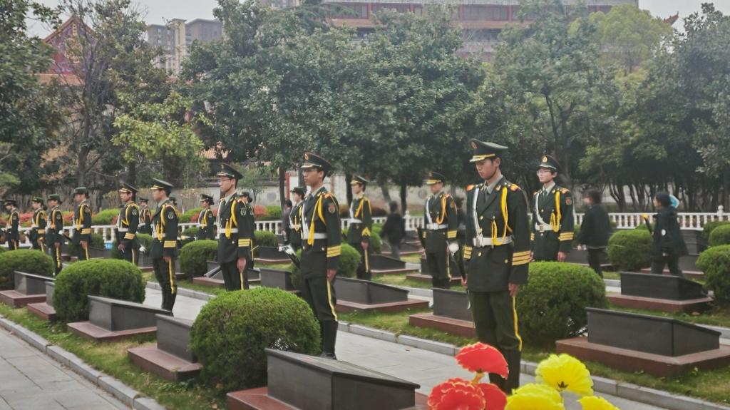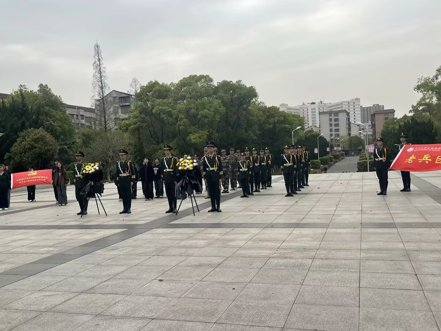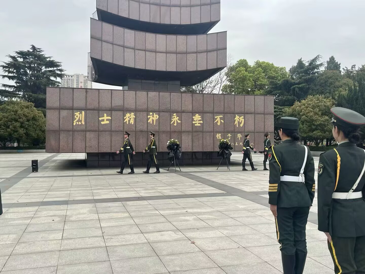 默哀毕,身着笔挺礼宾服的礼兵们,身姿矫健、神情严肃。他们迈着稳健整齐的步伐,护送着承载满满深情的花篮,稳步朝着烈士纪念碑前行。在全场人员饱含敬意的目光下,礼兵们一步步靠近纪念碑,以这一庄重神圣的仪式,深切缅怀英勇无畏的烈士们。