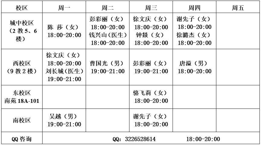 2)电话咨询:城中-8068012;西校区-8066850;东校区-8068012(表中值班时间段均可拨打)