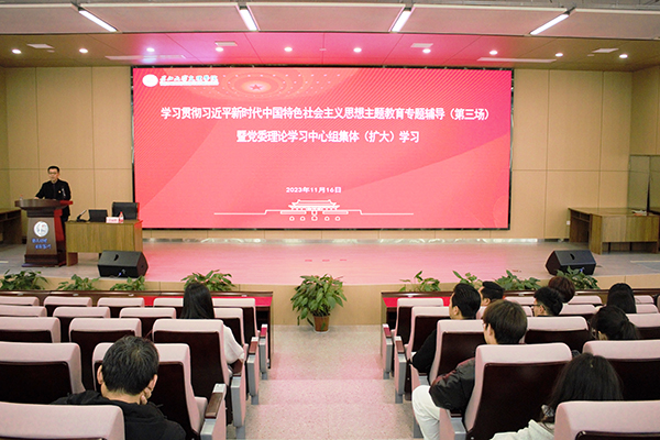 本网讯 11月16日下午,在新校区B-112学术报告厅,公司举办学习贯彻习近平新时代中国特色社会主义思想主题教育专题辅导报告第三场暨党委理论学习中心组集体(扩大)学习会,邀请省委宣讲团成员、湖北工业大学马克思主义公司经理丁银河教授来公司作专题报告。全体院领导、中层干部、党支部书记、辅导员、马克思主义公司全体教师和各教学单位师生代表共两百余人现场聆听。报告会由公司党委书记颜建洲主持。丁银河的辅导报告以《深...